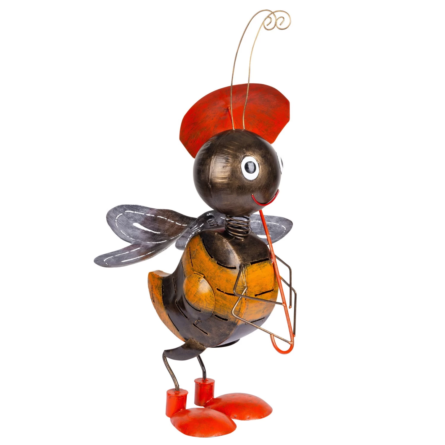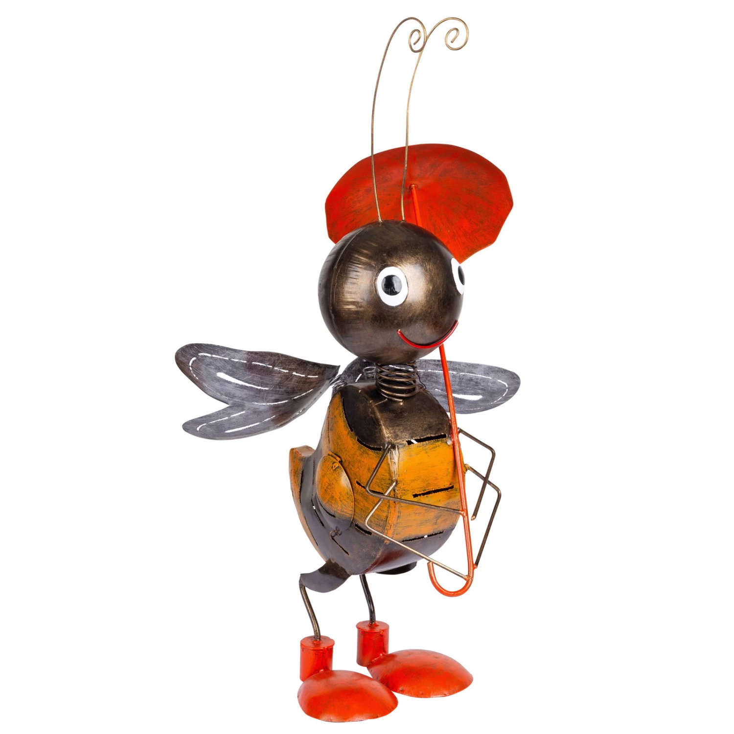 Heißen Sie in Ihrem Garten, auf Ihrer Terrasse oder Ihrem Balkon diese niedliche Biene von Kölle willkommen. Natürlich macht die sympathische Skulptur auch im Hauseingang, Wohnzimmer oder in der Diele eine ausgezeichnete Figur. Das tüchtige Bienchen unternimmt einen kleinen Spaziergang unter Ihrem runden Regenschirm und genießt die Ruhe. Das Gartenaccessoire besteht aus strapazierfähigen Stahlblechen, die in sorgfältiger Handarbeit entgratet und geschweißt werden. Bevor die Künstler bunte Farben auftragen, erfolgt die Grundlackierung. Nur so lässt sich gewährleisten, dass die Gartenskulptur witterungsbeständig bleibt. Wir empfehlen Ihnen jedoch, die Bienenfigur während der kalten und nassen Jahreszeit an einem trockenen Ort aufzubewahren. So verlängern Sie die Lebensdauer des Accessoires und haben noch lange Jahre Freude an Ihrer Biene mit Sonnenschirm.