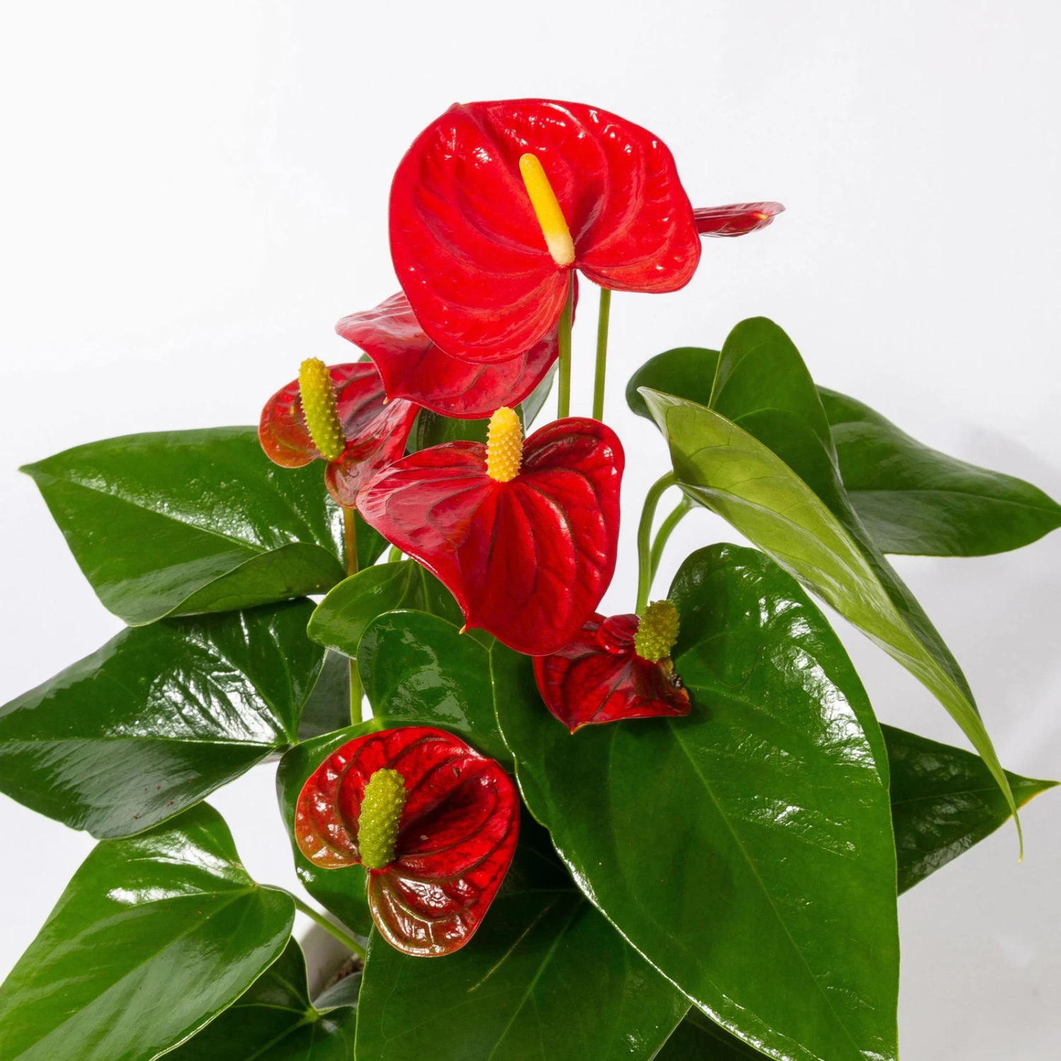 Die Flamingoblume (Anthurium andreanum) ist eine klassische blühende Zimmerpflanze und besticht mit einfacher Pflege und apartem Aussehen. Charakteristisch sind die kräftig grünen, glänzenden Blätter, die oval bis herzförmig ausgebildet sind und an einem längeren Stiel stehen. Die horstbildende Pflanze wächst aufrecht bis buschig und kann eine Höhe von bis zu 50 cm erreichen.