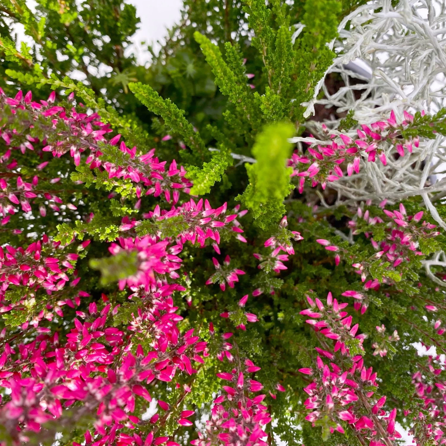 Die Knospenheide verdankt ihren Namen ihren rosa und gelben Knospen, die sich typischerweise nicht öffnen und über viele Monate ansprechend und unverändert bleiben. Bei dem Silberdraht handelt es sich um einen Korbblütler und die grün-gelben Blütenkörbchen blühen von Juli bis September, jedoch erst im zweiten Jahr, nach einer frostfreien Überwinterung.