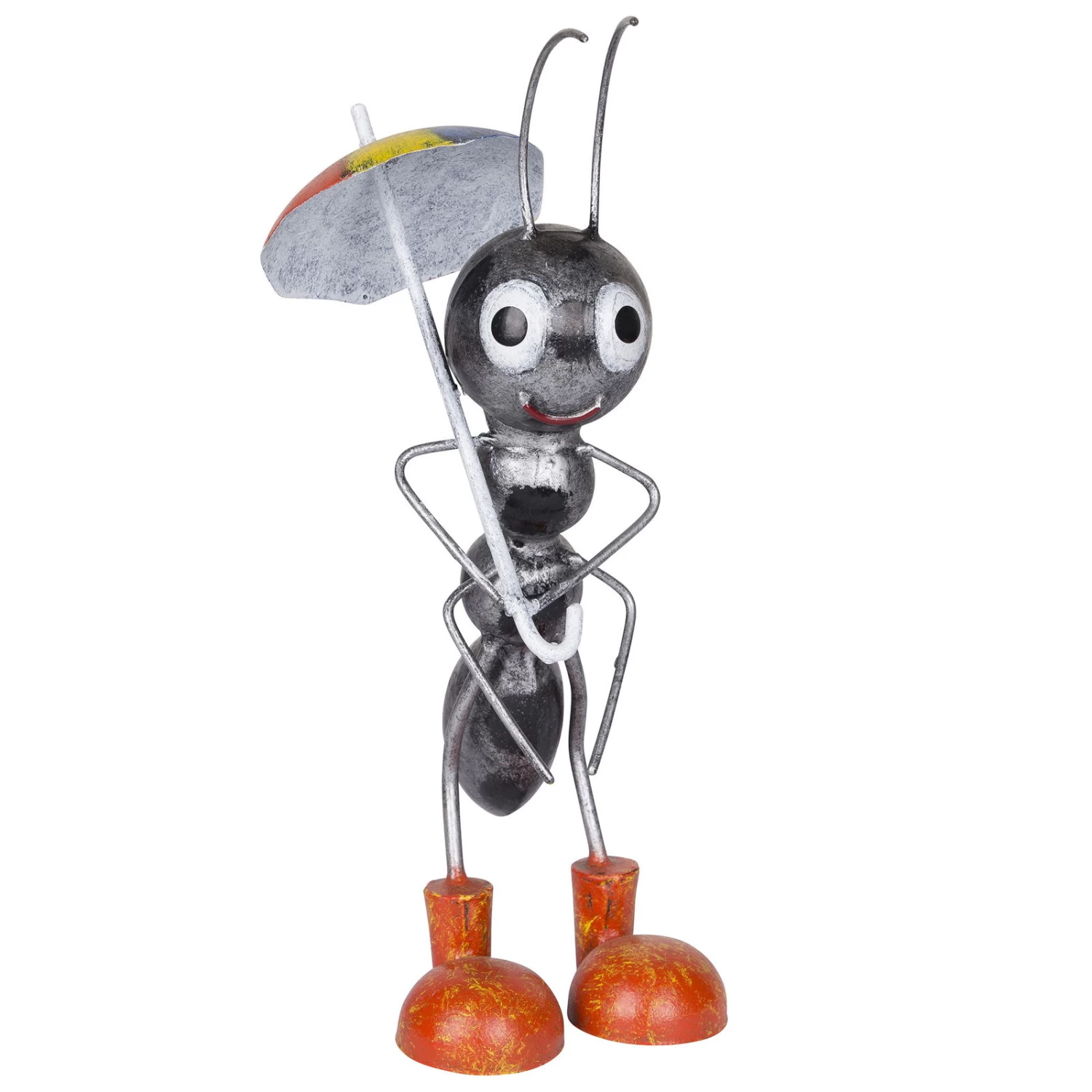 Alle Blicke werden auf Ihren Garten gerichtet sein, wenn Sie sich die niedliche Ameise mit Schirm der Größe S holen. In liebevoller Handarbeit werden die Einzelteile zunächst geformt und anschließend zusammengeschweißt. Für eine hochwertige Optik werden dann die Schweißnähte entgratet, verputzt sowie gereinigt. Sie können also sicher sein, dass beim endgültigen Produkt keinerlei Unebenheiten der Produktion mehr zu sehen sein sollten. Eine hochwertige Grundierung wird während eines Tauchbads aufgetragen. Diese schützt das Metall vor Schädigungen durch Witterungseinflüsse. Egal, ob Sie die Figur Sommer oder Winter im Freien stehen lassen, eine jahrelange Anwendung ist möglich. Alle Dekoelement dieser Art von Kölle werden im letzten Arbeitsschritt mit einem kleinen Pinsel so bearbeitet, dass Details per Hand aufgetragen werden.