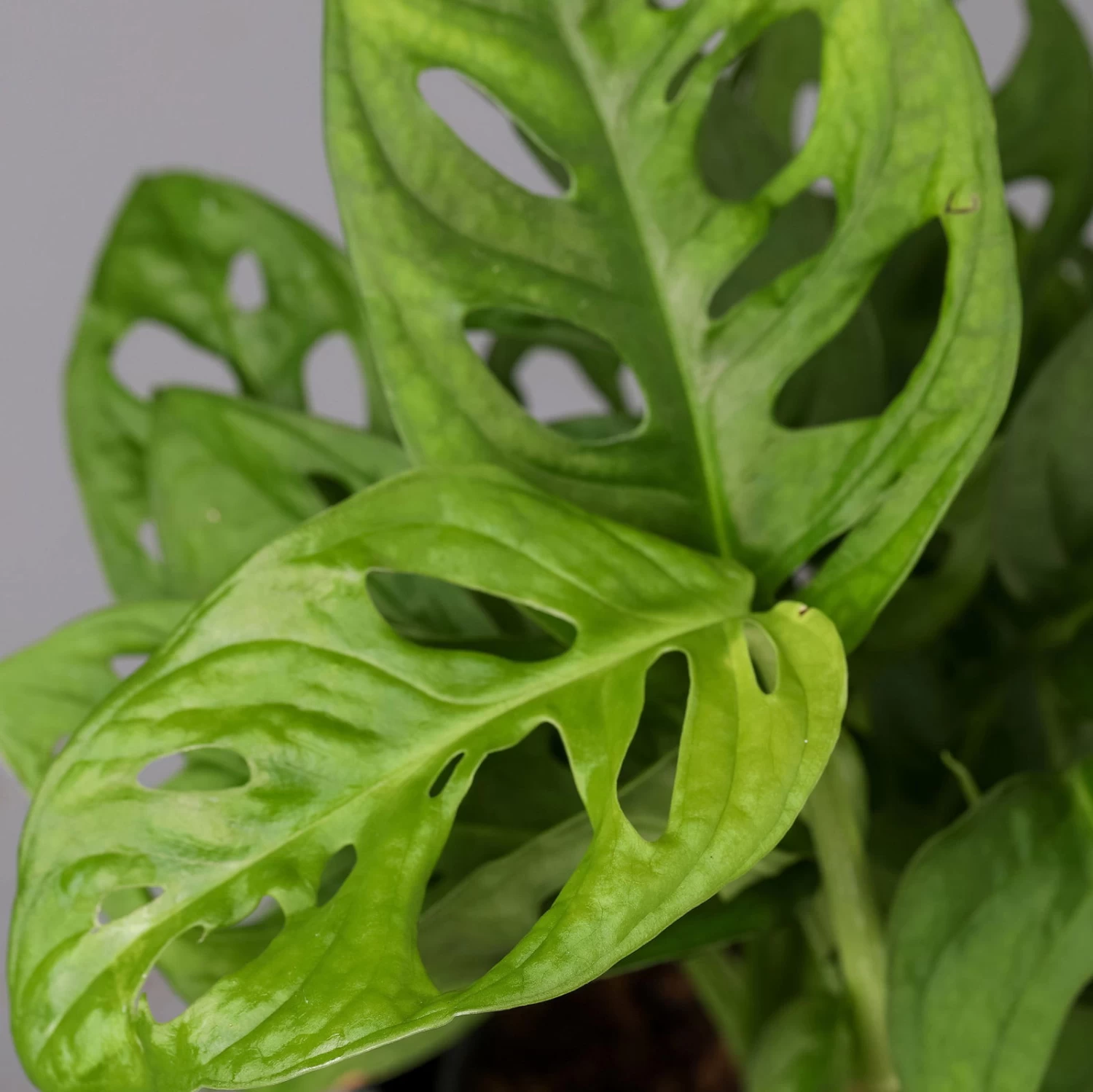 Das Schiefe Fensterblatt (Monstera adansonii) gilt als absolute Trendpflanze und bietet mit seiner außergewöhnlichen Optik die optimale Grundlage für echtes Dschungelfeeling in Ihrem Zuhause. Charakteristisch sind die elliptischen, zugespitzten Blätter, welche von mehreren Durchbrüchen durchzogen sind. Das verleiht der Pflanze ihr löchriges Aussehen und ihren Beinamen ‚Swiss Cheese Plant‘ (zu deutsch: ‚Schweizer Käse-Pflanze‘). Die Blätter sind kräftig grün uns sitzen an langen Stielen. Die Monstera ist eine Kletter- und Rankpflanze und bildet Luftwurzeln aus, mit denen sie sich in der Natur an Felsen und Baumstämmen emporrankt. Bei der Zimmerkultur kann der Pflanze eine Rankhilfe in Form eines Moosstabs zur Verfügung gestellt werden. Ohne Rankhilfe wächst das Fensterblatt überhängend und kann auch in einer Blumenampel kultiviert werden. Kletternd kann die Pflanze Höhen von bis zu 3 Metern erreichen.